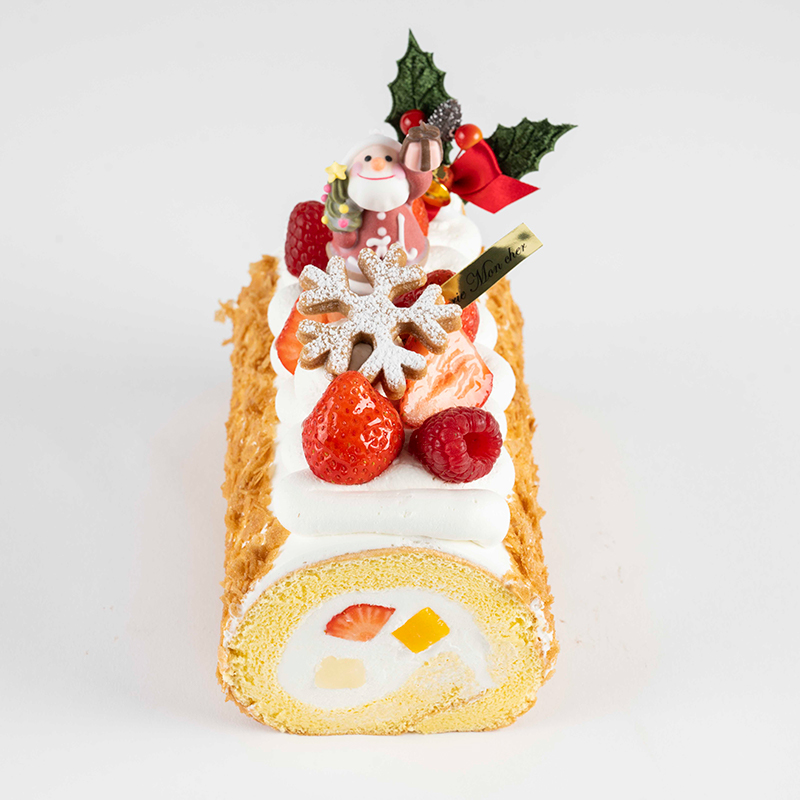 クリームを楽しむモンシェールのブッシュ・ド・ノエル 3種のフルーツ(いちご・洋梨・黄桃)をしのばせた「堂島ロール」を、真っ赤ないちごや雪の結晶をかたどったクッキーでキュートにデコレーションしました。ヨーロッパのクラシックなクリスマスケーキ“ブッシュ・ド・ノエル”をモンシェール風にアレンジした、愛らしいサンタクロースが目印の心温まるひと品です。
