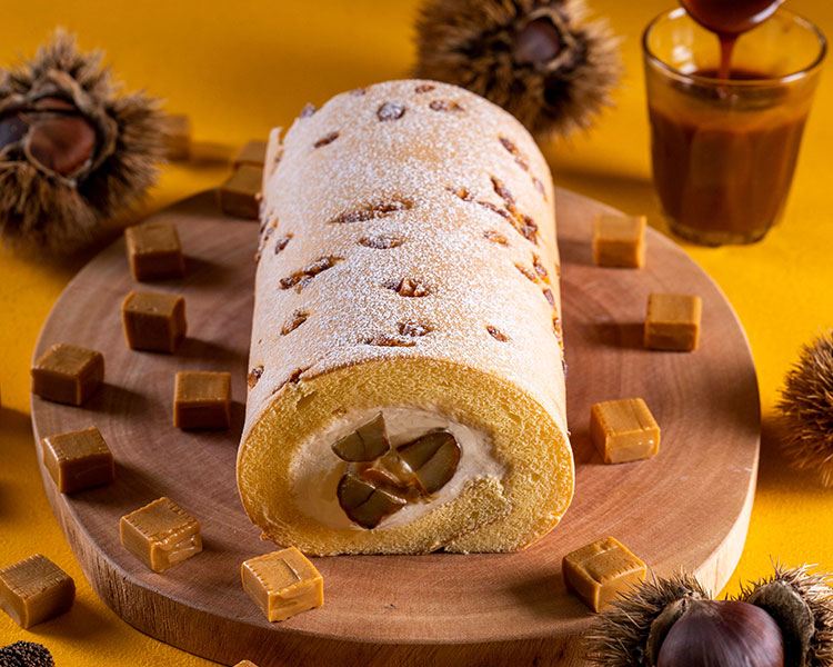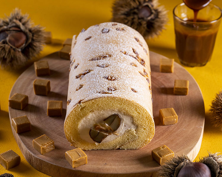 コクのあるキャラメルクリーム、とろけるようなマロンクリーム、艶やかな渋皮栗の甘露煮、そしてほどよい塩味の塩キャラメルクリームを、香ばしいキャラメルナッツを散りばめた生地でひと巻きにしました。