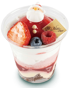 ベリーの甘酸っぱさを堪能できるバルフェ。ショコラ生地、ベリーのムースにジュレ、カスタードを重ね、ベリームースのサンタを飾って仕上げました。