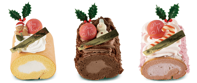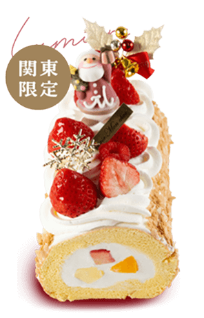 3種のフルーツ(いちご・洋梨・黄桃)をしのばせた「堂島ロール」を、ヨーロッパのクラシックなクリスマスケーキ“ブッシュ・ド・ノエル”風にモンシェールらしい繊細さと愛らしさでアレンジ。