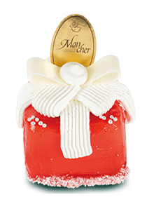 甘酸っぱいフランボワーズソースを忍ばせたレアチーズムースをベリーのグラサージュで包み、クリームをりぼんに見立てて絞りました。