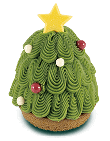 ほうじ茶のマドレーヌに渋皮栗の甘露煮をのせ、仕上げに白餡を練り込んだ抹茶のモンブランクリームで、クリスマスツリーをイメージしたデザインに。