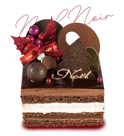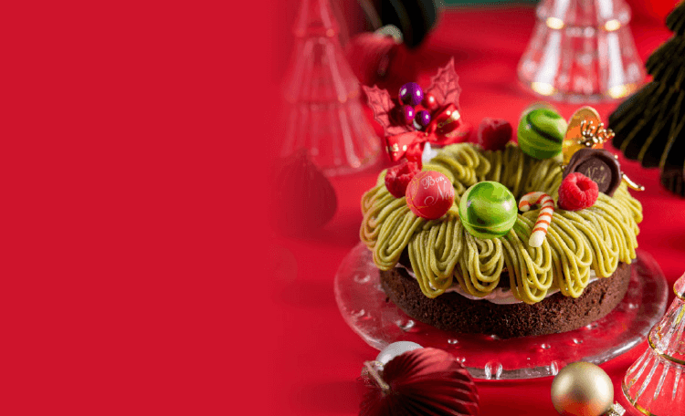 しっとりと焼き上げた濃厚なチョコレートケーキにミルキーなクリームをサンドし、ピスタチオを合わせたモンブランクリームを絞りました。リースを思わせるデコレーションで、心躍る華やかな仕上がりに。ピスタチオの香りとショコラの深みが絶妙に重なる、聖夜にぴったりのケーキです。