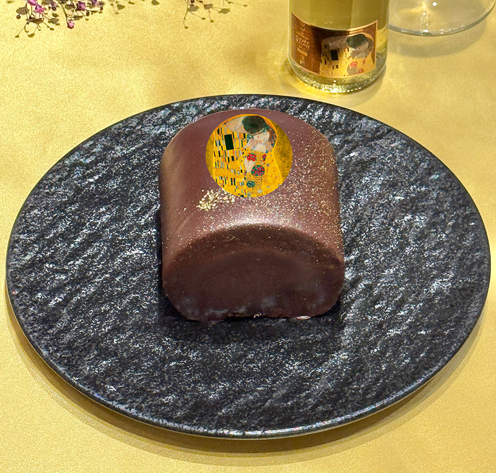 ショコラと金箔のコントラストがクリムトのきらびやかな世界観を思わせる、熟練パティシエが“食べるアート”として表現。